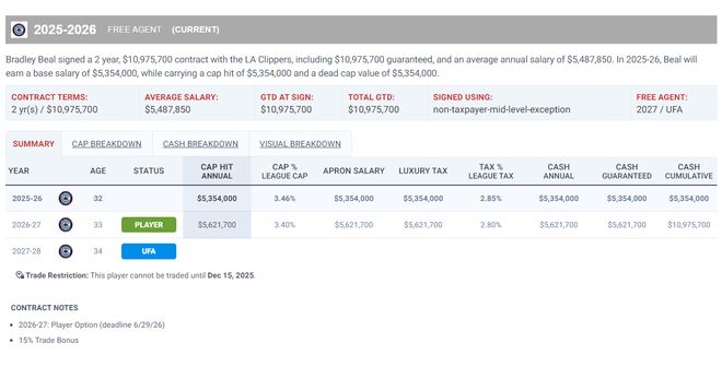 隨后比爾以兩年1100萬的合同簽約快船,這份合同實際上是兩年1097萬,25-26賽季為535萬,26-27賽季562萬(球員選項),這份合同還包含15%的交易保證金。