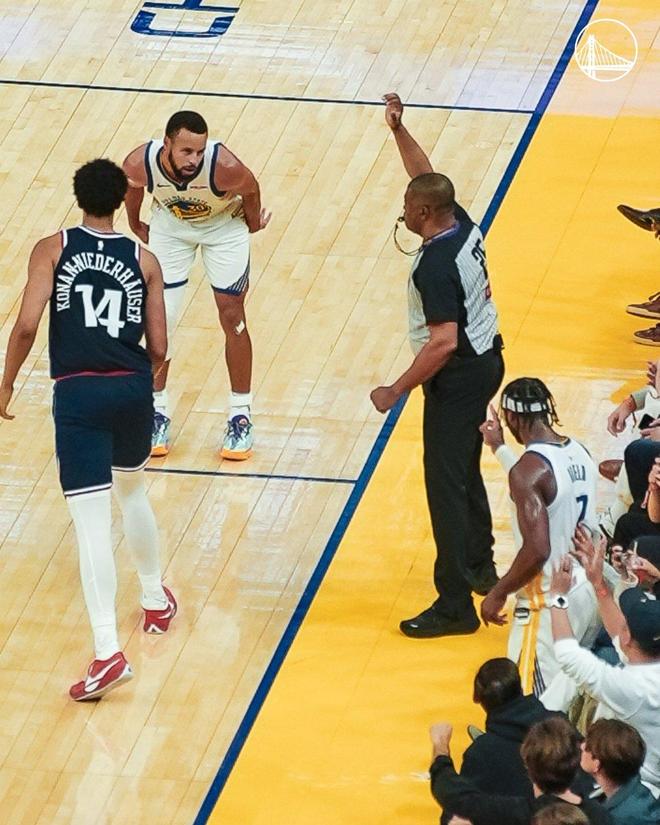 戴維斯與比爾在禁區(qū)斗法,斯潘塞2罰全中,庫里連得5分,波杰姆斯基籃下得分,勇士轟出了11比2的攻勢,將分差縮小至3分??票炔祭拭羞h投為快船止血,格林籃下得分。半場打完,勇士以43比47落后。